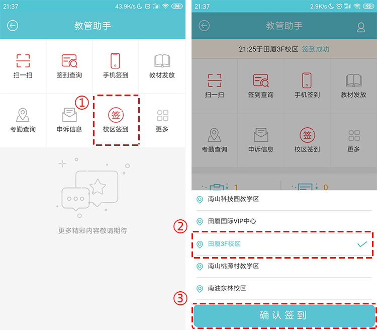 1、教管 打开云办公APP,进入教管助手,在【校区签到】中选择负责校区签到(每天早上签到,只有签到后才能收到)。