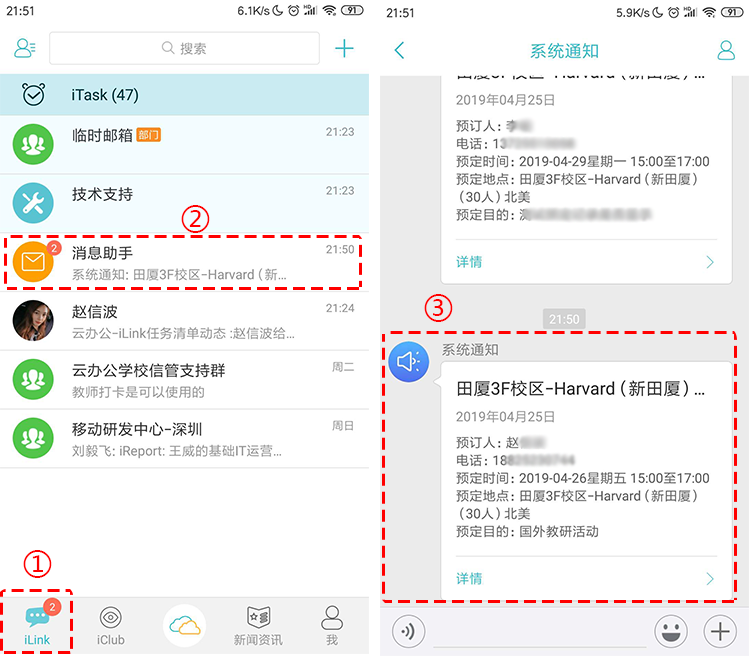 2、有教室被预定(或取消预订)时,教管手机会收到具体的教室预订信息。