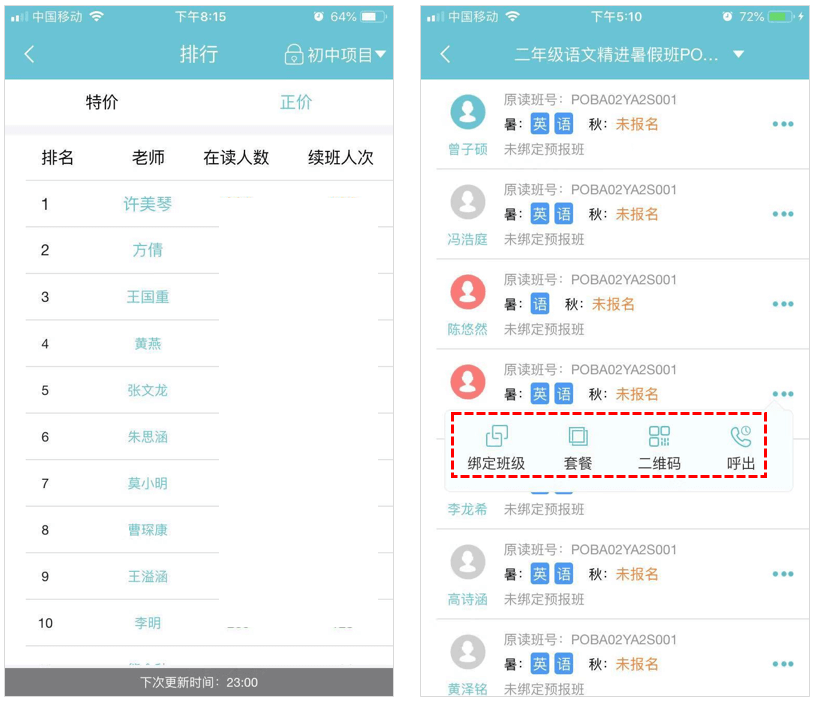 手机上即可查看学员扩科情况,部门排名,还能快捷生成报名二维码,家长一键报班。