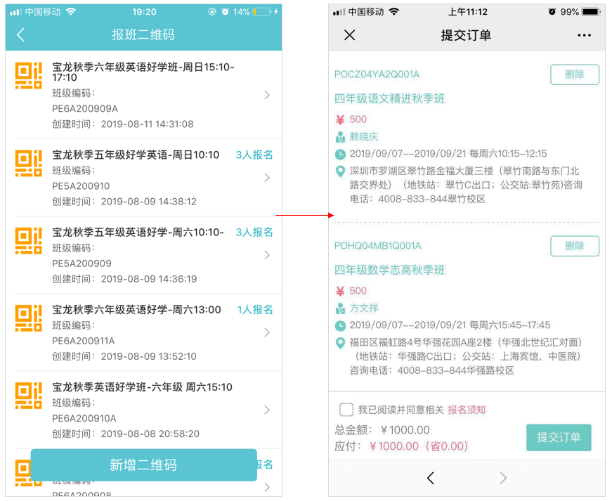 左图:云办公【班级二维码】列表页 右图:家长【微服务】 订单页
