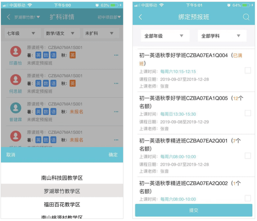 查看、跟进某部门某老师,学员的扩科情况(如学员秋季续了哪几科),生成报班二维码,家长一步完成报名,帮助提高扩科占比;