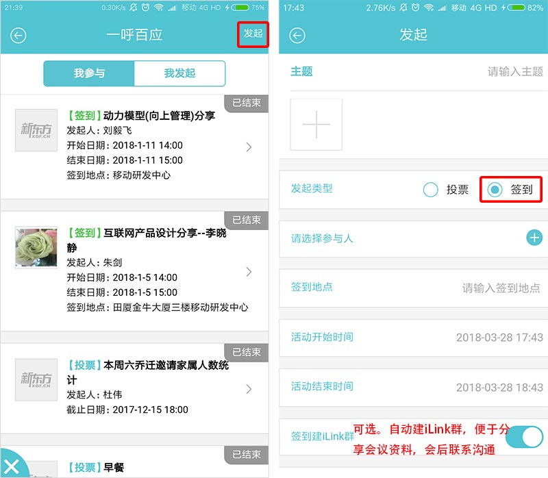2、点击右上角【发起】按钮,然后填写此次会议/活动的相关信息(主题、参与人、签到地点、活动开始/结束时间、是否签到建iLink群),类型选择“签到”,如下图: