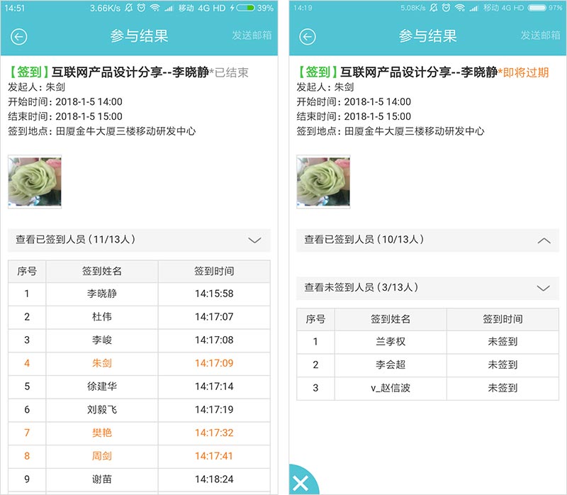 点击进入活动,可以直接查看签到情况;发起人还可将签到结果发送至自己集团邮箱;