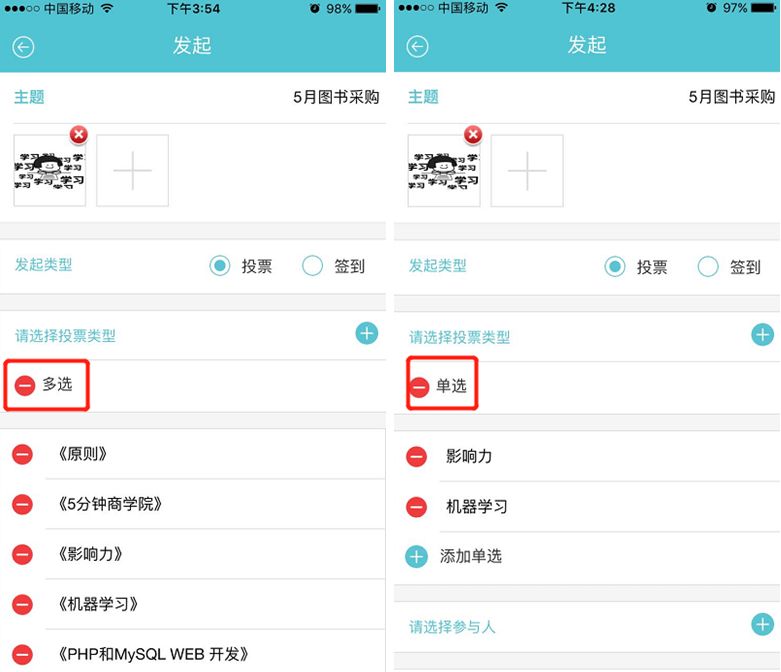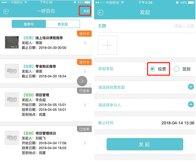 2、 点击右上角【发起】按钮。填写投票主题(可附图),类型选择“投票”。