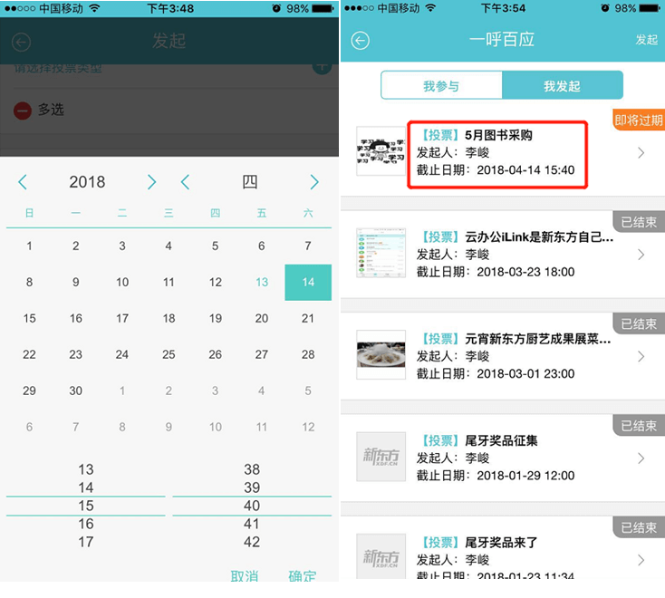 5、选择投票截止时间,点击“发起”,即成功建立一个投票,参与人将会收到邮件通知(发起人也可以投票)。