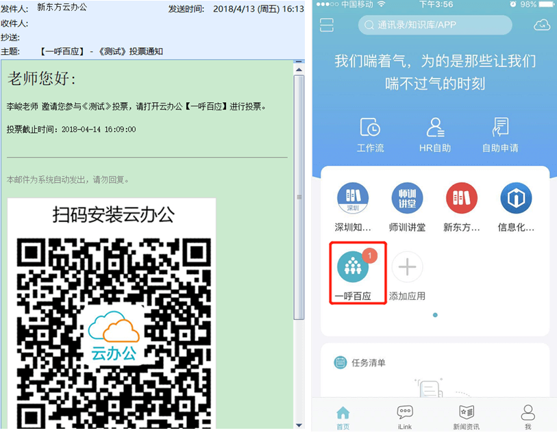 1、 参与人除邮件提醒外,云办公首页“一呼百应”的图标上也会显示通知。