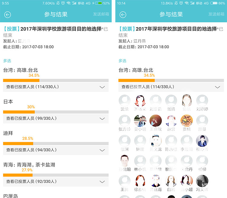 (2)发起人点击发送邮箱可将结果明细发送到自己集团邮箱中。