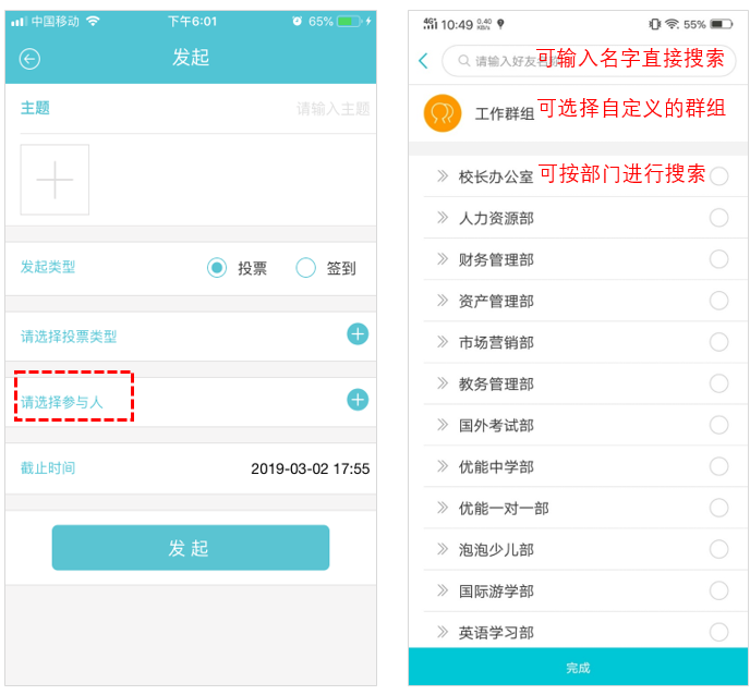 选择参加投票的人员,可以通过群组、部门添加,也可通过搜索姓名、邮箱添加个人