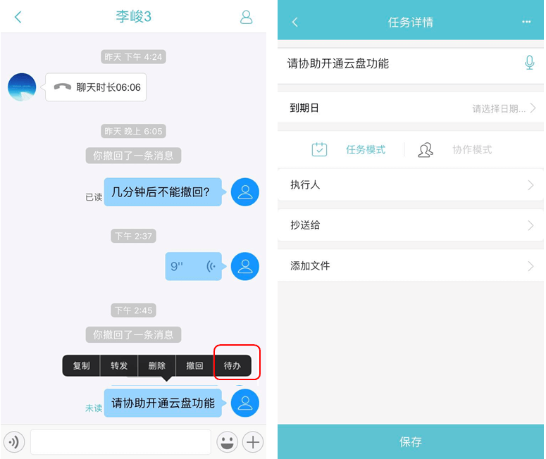 长按聊天记录,可将其添加到待办任务,设定明确时间节点及责任人,方便跟踪进度(待办任务的具体操作可点击阅读“【iLink任务】使用说明”)
