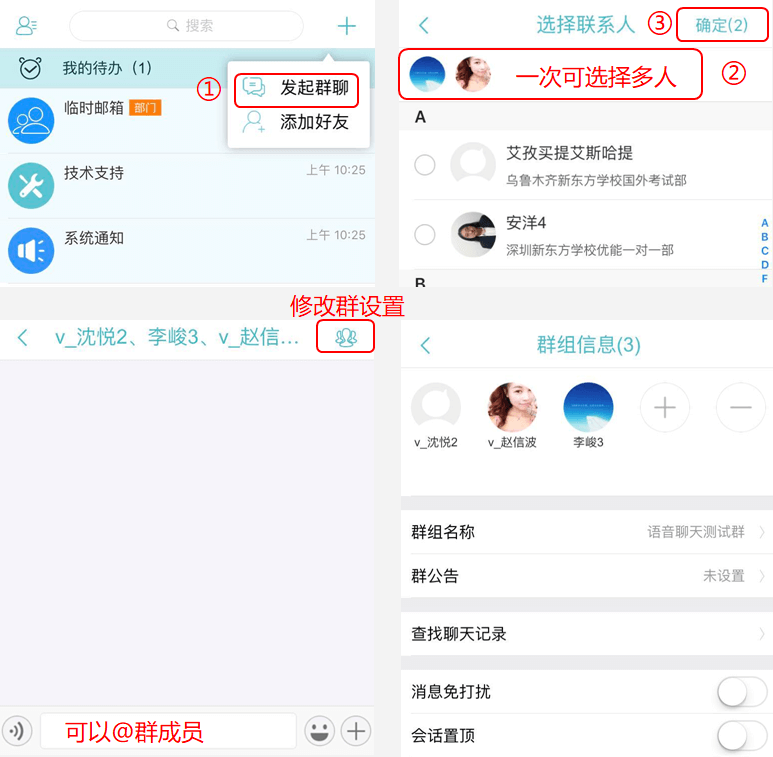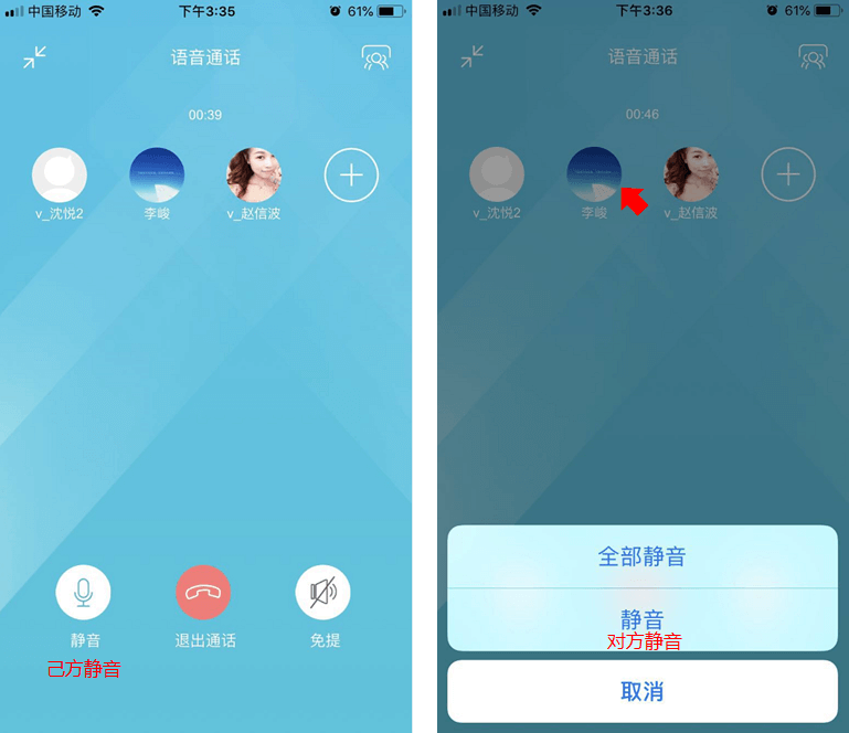 多人语音会议发起人点击每个人头像可选对方“静音”或全部静音