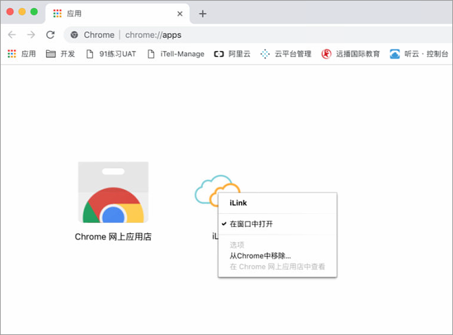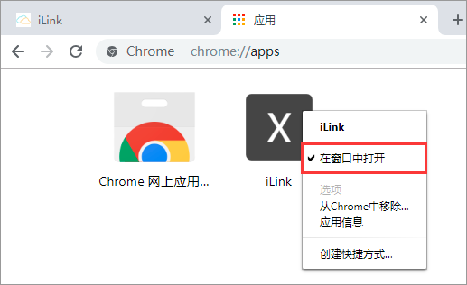 4、点击Chrome浏览器的【应用】,右键单击iLink,检查是否已勾选“在窗口中打开”。