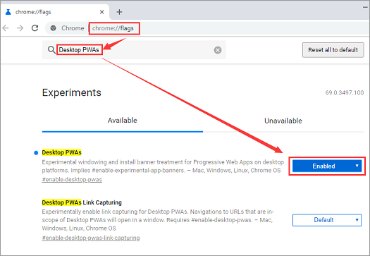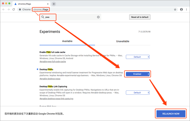 1、打开谷歌Chrome浏览器,在地址栏输入Chrome://flags,搜索pwa,将Desktop PWAs的选项将其设置为Enabled,然后重启Chrome浏览器。