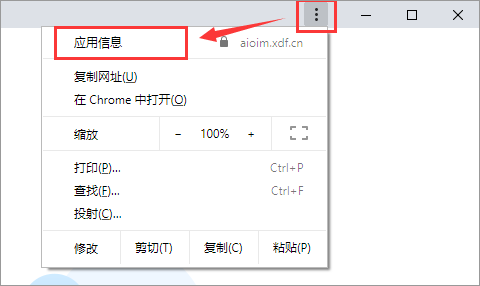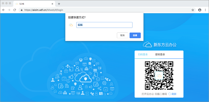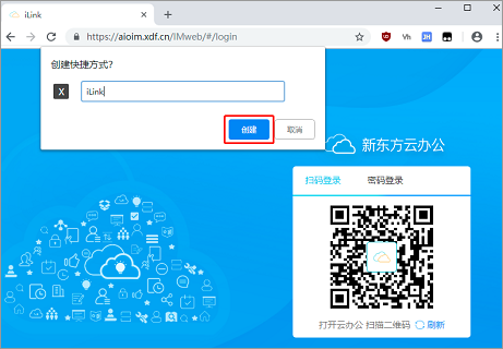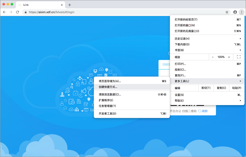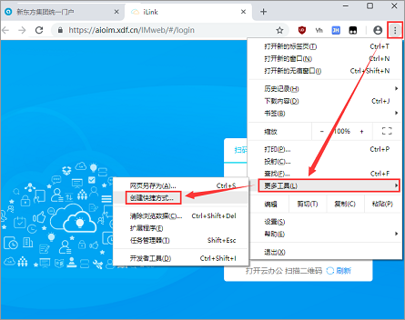 2、在浏览器中打开iLink(http://iLink.xdf.cn),然后点击浏览器右上角的“┇”按钮,依次选择“更多工具”→“创建快捷方式…”;