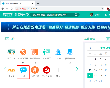 1、使用Chrome浏览器打开新东方集团统一门户网站,点击打开iLink网站。