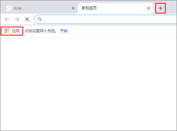 4、点击浏览器顶部的“+”按钮,打开一个“新标签页”,然后点击“应用”。