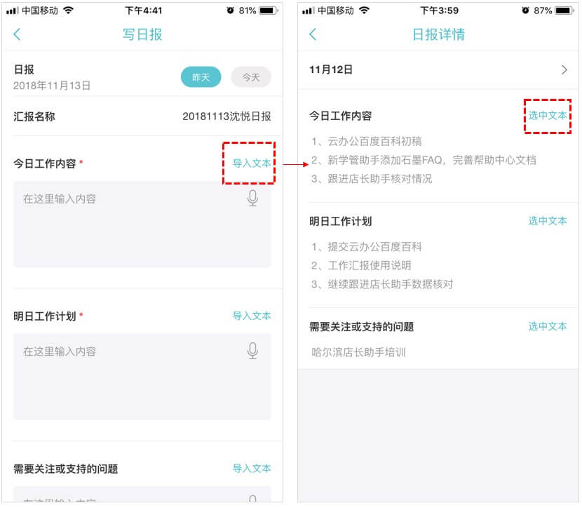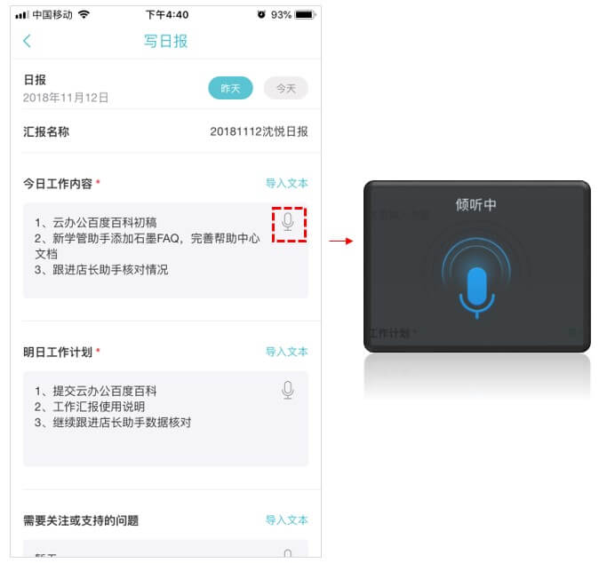 2、填写工作内容(支持语音输入)。完整的内容有助于让上级和同事更好的了解目前工作情况,和执行中遇到的问题;