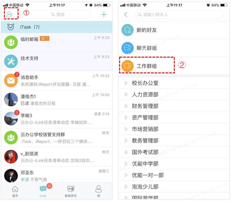新建群组时,通过【iLink】-左上角图标-工作群组进行创建