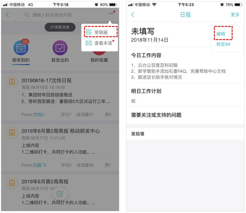 4、合并汇报:汇总部门多人周报时,不用手动复制每篇汇报内容,直接生成合并版本并发送,发送后可再次编辑。