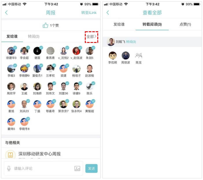 3、 报告打开后,“发给谁”中对应的人头像上将显示“√”,点击“全部”还可以查看转阅、点赞情况;