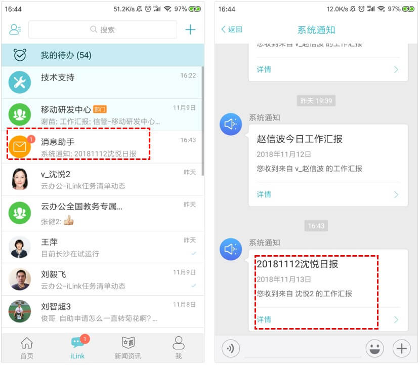 1、工作汇报发出后,接收人【云办公-iLink】会有消息提醒,点击即可查看(需要允许云办公发送通知);