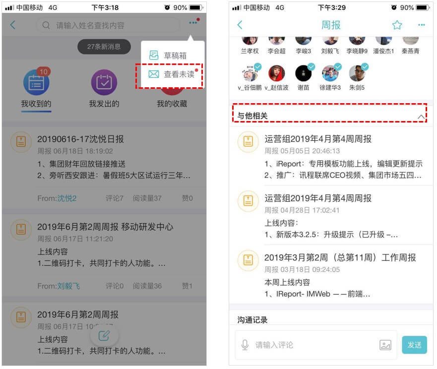 报告详情自动关联发送人最近的三条同类型汇报,方便查看过往内容;