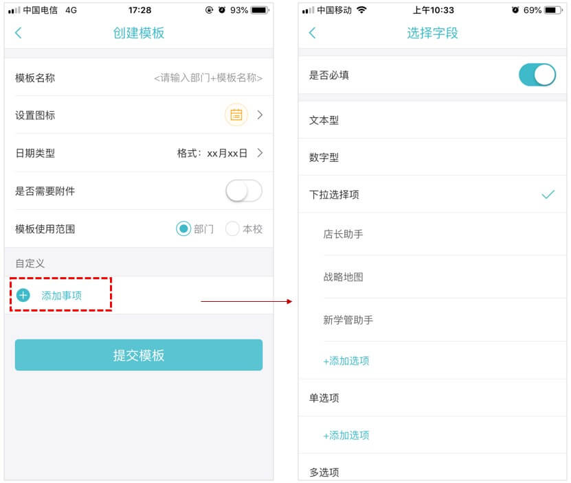 3、自定义模块,包括文本、数字、下拉菜单、单选、多选等类型,可自由组合;