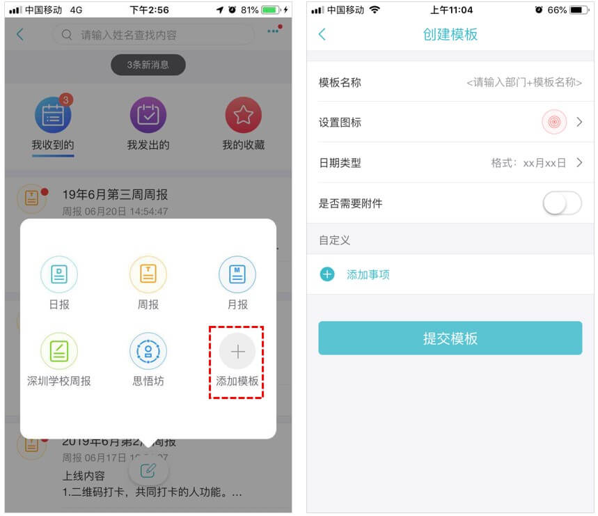 1、打开【云办公-iReport】,根据需求选择模板,默认模板有月报、周报和日报三种模式;还可以在“添加模板中”找到已通过的自定义模板,如深圳学校周报;