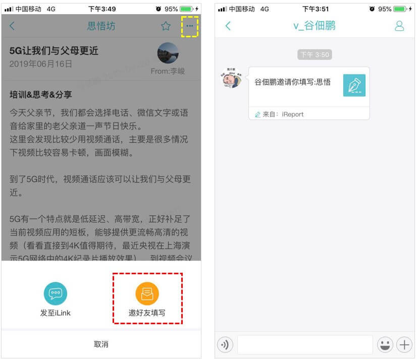 5、 如果需要将自定义模板发给其他人,可以新建一篇汇报,点击右上角,邀请好友填写,对方接受后模板将自动保存。