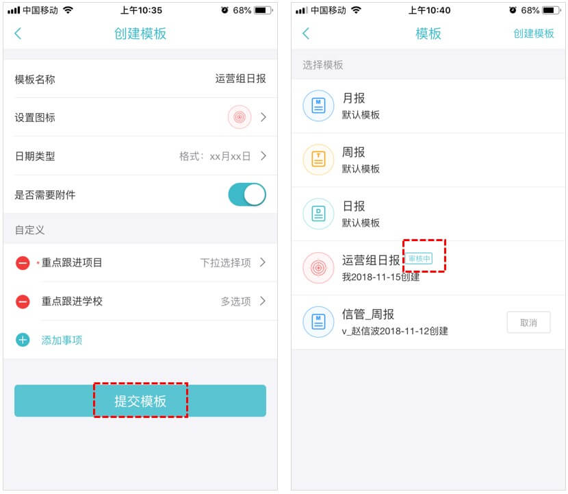 4、模板提交后,需通过审核(目前由云办公支持组负责)才能正式使用,未审核前可以修改,审批完成后将不能进行修改;