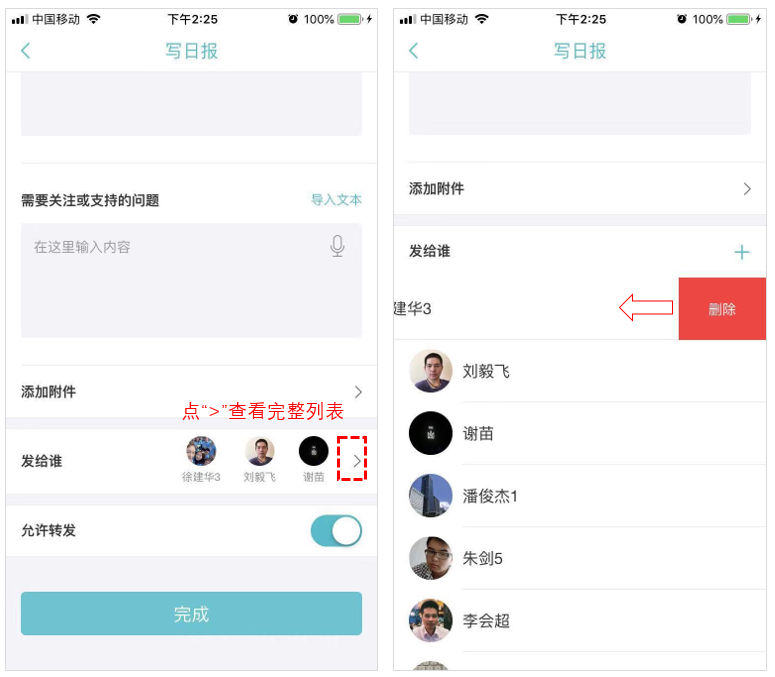 5、可以同时发给多位同事(选择个人或群组),打开列表后,左滑名字可删除人员;