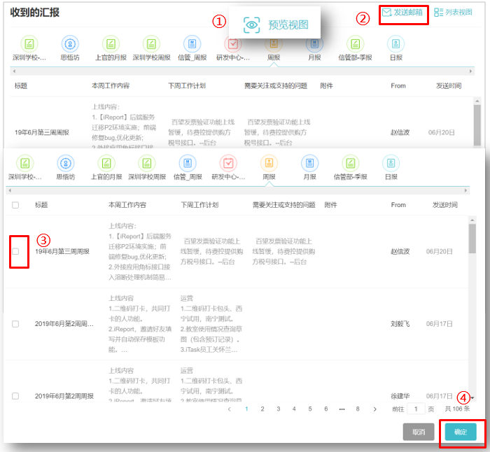 3、 目前导出收到的汇报到邮箱限PC端,选择“我收到的”→“预览视图”→“发送邮箱”,然后选择需要导出的汇报,汇报将以excel附件的形式发到您的邮箱。