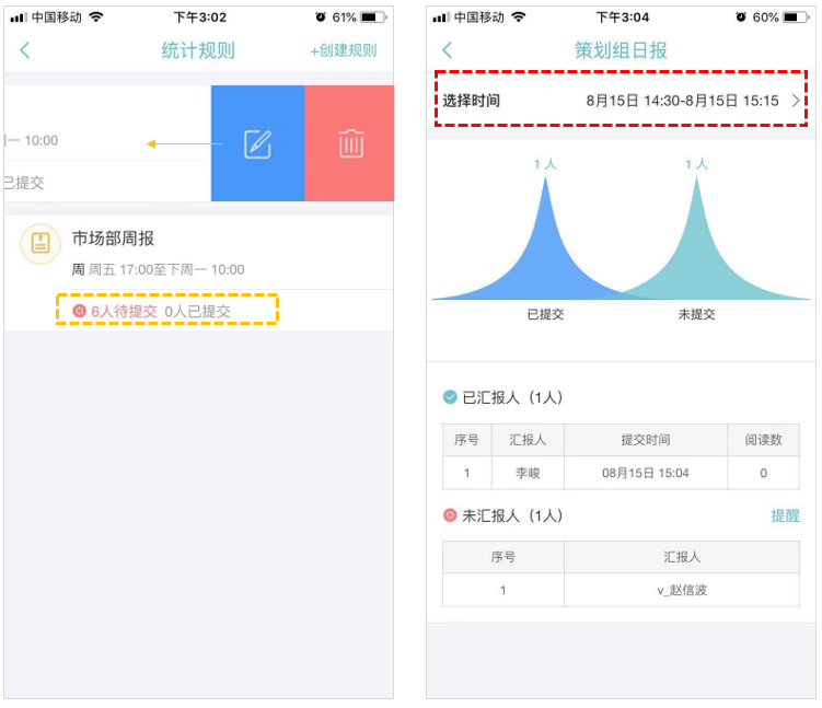 6、了解汇报人提交情况,无需手动统计,可设置规则,随时查看报告(点击查看设置方法)