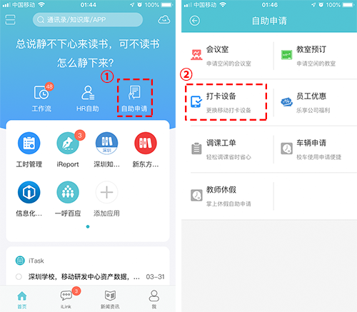 操作方法: 1、打开云办公APP首页 -「自助申请」-「打卡设备」。