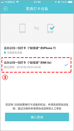 适用人员:使用云办公进行考勤打卡的员工(二维码打卡、摇一摇打卡) 适用场景:更换新手机、手机故障时使用的备用机。 更换次数:每自然年内,可以自助更换3次;超过次数将转人工备案更换。