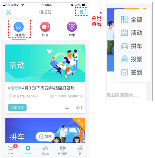 1、查看:点击【iClub】,选择【一呼百应】,可分类浏览已分布的内容,参与、点赞、评论和转发;