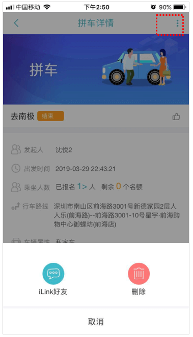 如果因故需要删除拼车,被邀请或已报名的人将收到iLink通知;