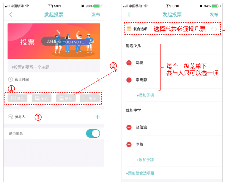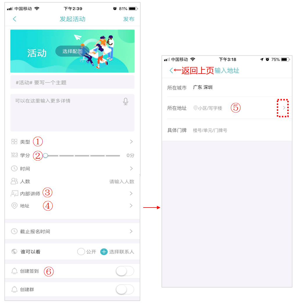 ①选填,可从图片库选择(发起活动、签到、投票时,与此相同);