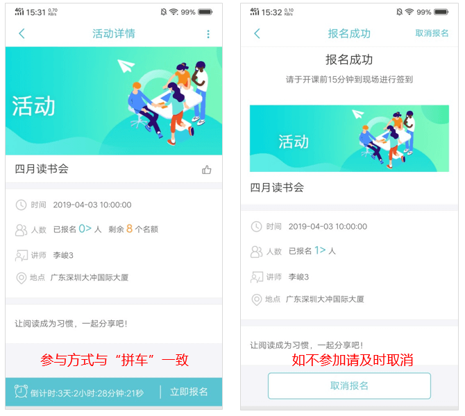 活动:公开课、培训、团建、找合租……用“活动集市”,提高传统组织和报名效率;