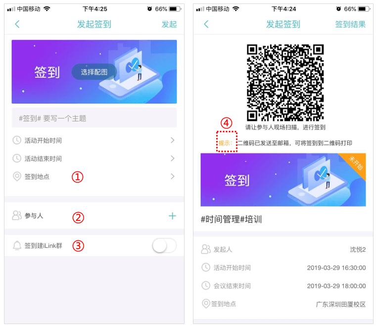 ③不在“参与人”范围的人不可以签到。完成“发起”后,参与人的iLink和邮箱也会收到通知;