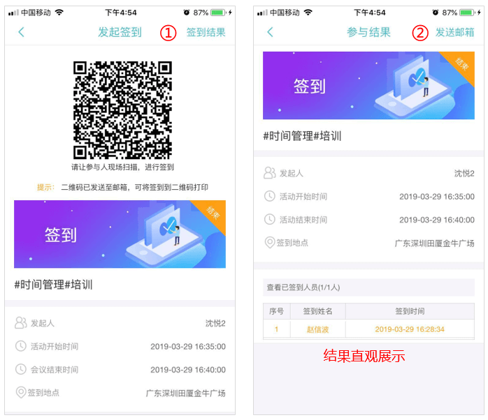 签到:无需纸质登记+人工统计,扫码签到自动记录,结果一目了然;