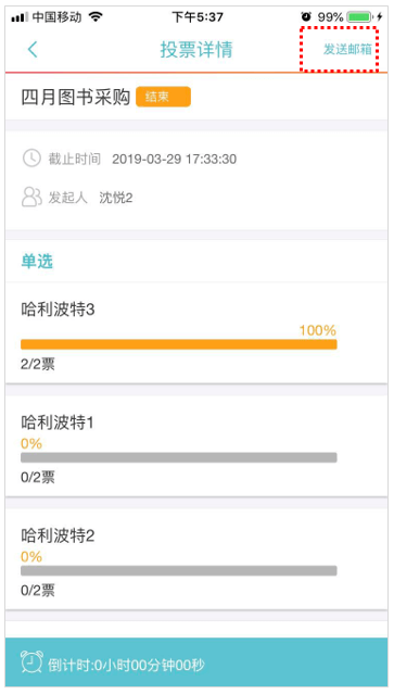 通过【我的】-“我发起的”,查看投票情况,详情可发送到邮箱(excel格式)