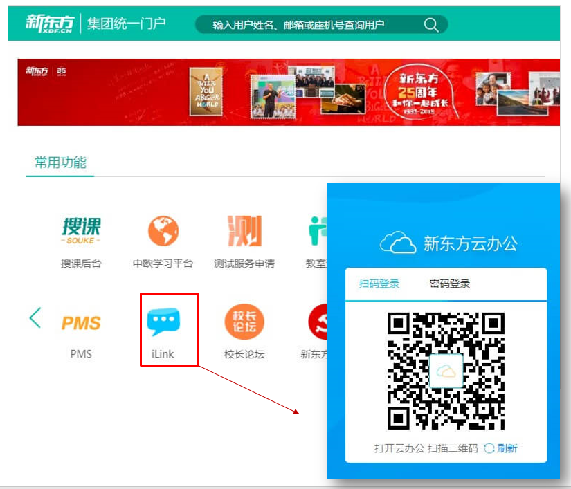 谷歌浏览器中打开OA统一门户,在【常用功能】中点击iLink图标(或直接输入http://ilink.xdf.cn)使用云办公扫码,也可用账号密码登录。
