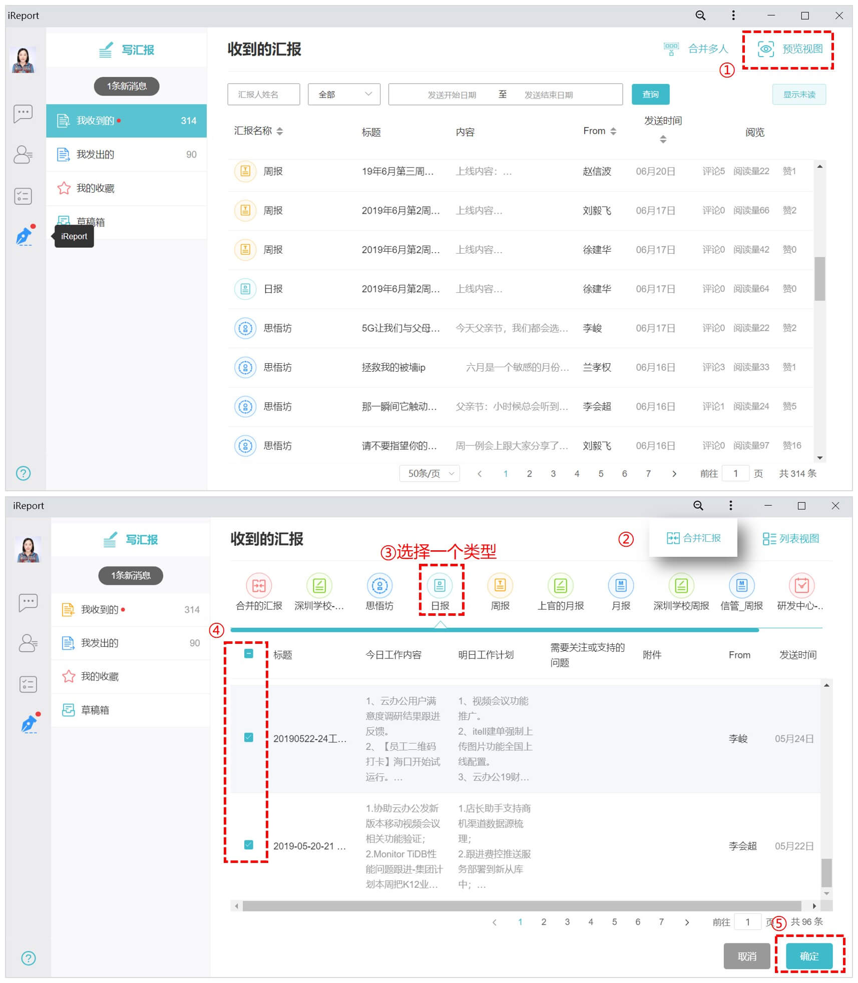 (2)【合并文档】-选择模板类型- 选择需要合并的汇报 -【确认】