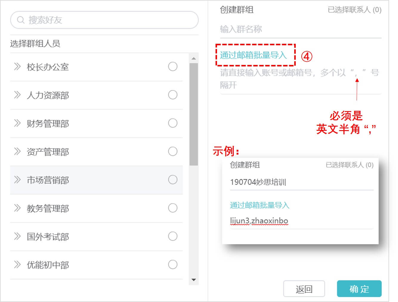 3、输入群组名称和需要导入的人员账号,每个账号间用英文逗号【,】隔开,点击“确认”,完成建群